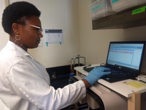 Right: Naomi sets up the Catachem, an autoanalyzer, for analysis of the serum samples in the lab.