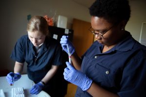Left: Malia (left) and Naomi (right) pipette serum into microcentrifuge tubes after collection from cows for lab analysis. Thanks to Michael P. King for the photograph.