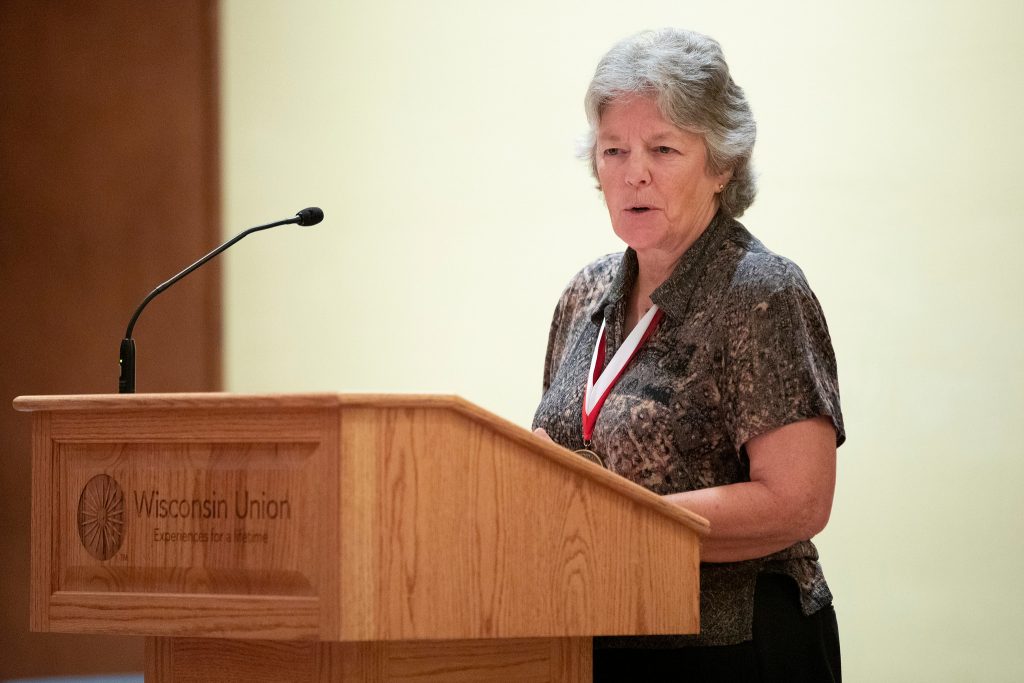 Dr. Barbara Barton gives remarks after being awarded with the Distinguished Alumni Award. Thanks to by Michael P. King/UWMadison CALS for the photo.