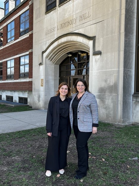 Dr. Mariana Paiva Rodrigues (right) and Dr. Heather White (left) stand outside the Ernest L. Anthony Hall on the MSU campus, which is home to the Animal Science Department where Dr. VandeHaar and Dr. Zhou conduct their research.